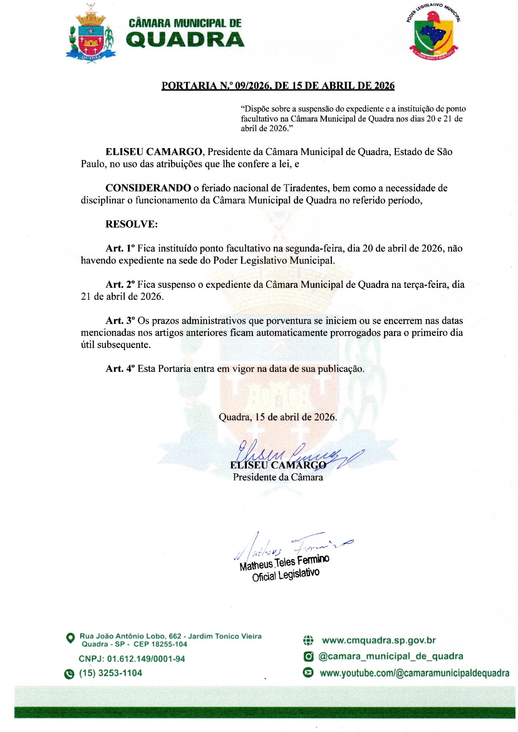 A Câmara Municipal de Quadra informa que o expediente estará suspenso nos dias 20 e 21 de abril, em razão do ponto facultativo na segunda-feira (20) e do feriado nacional de Tiradentes, celebrado na terça-feira (21).