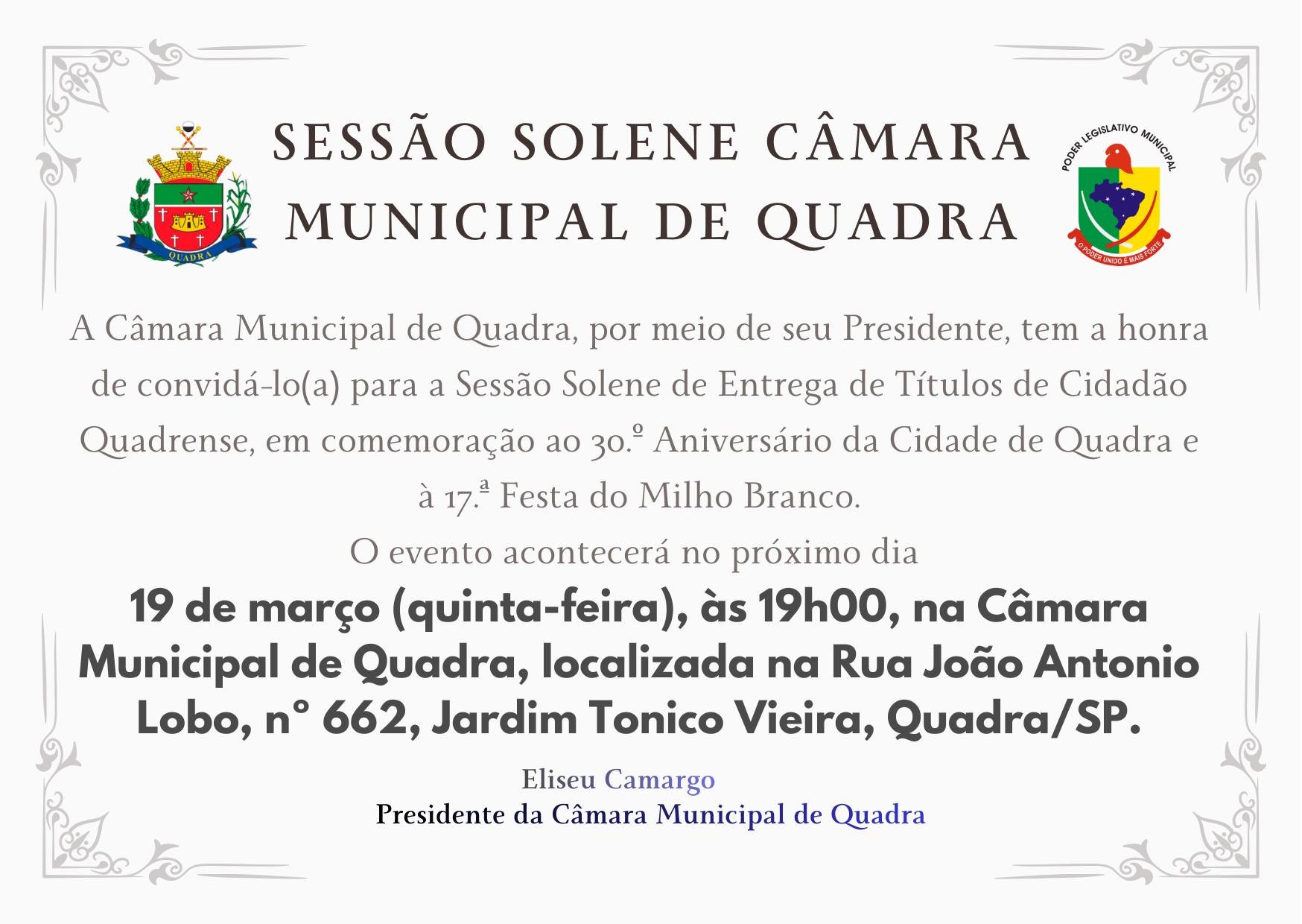 A Câmara Municipal de Quadra convida você para um momento especial de reconhecimento e celebração da nossa cidade.
